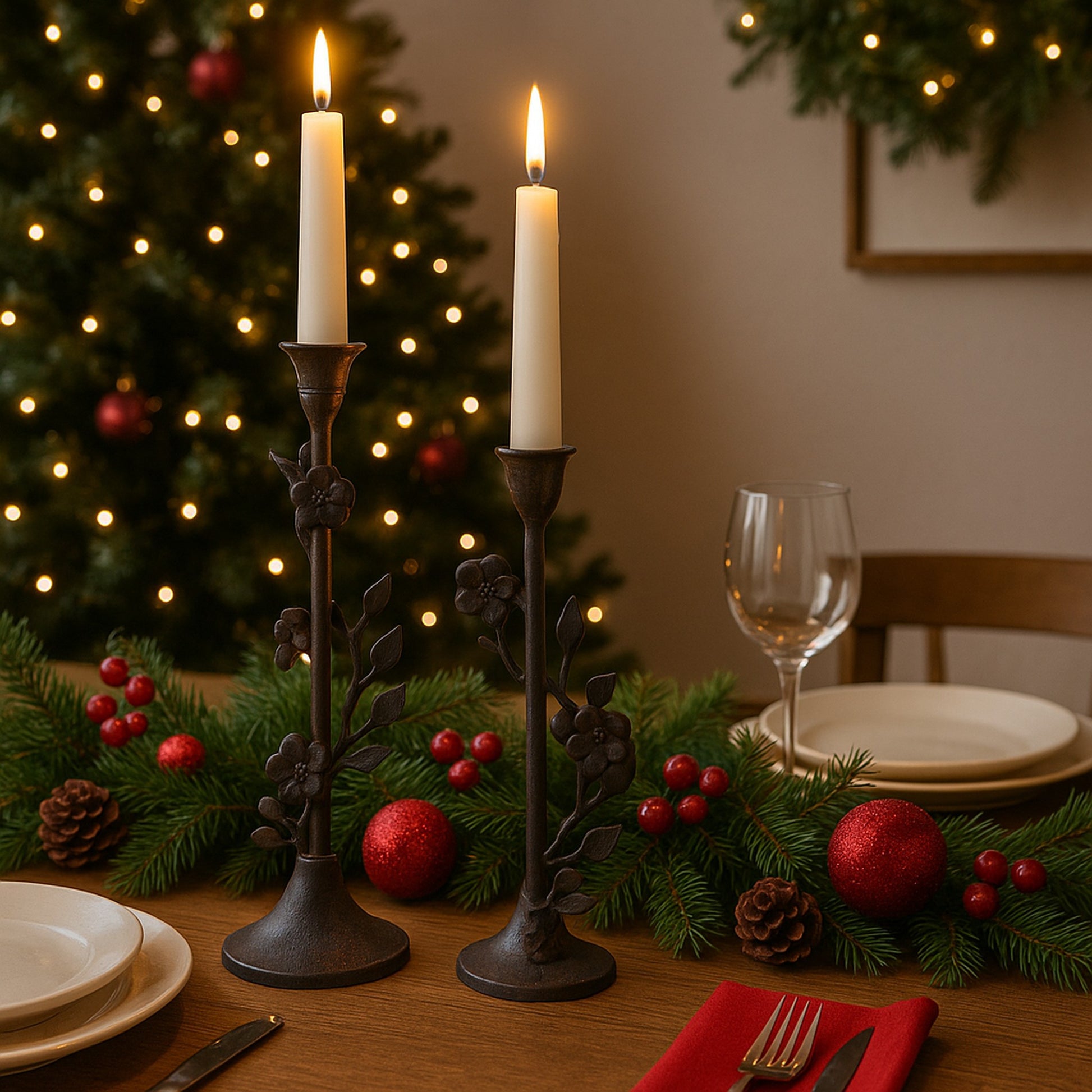 Inspired by nature’s grace, this set of two taper candle holders features intricately sculpted branches entwined with delicate leaves and flowers. Handcrafted from aluminium with a rich antique bronze finish, the pair stands 39cm and 28cm tall, adding a touch of organic elegance to any setting. Perfect for dining tables, mantels, or consoles, they complement both natural and LED taper candles — a beautiful statement piece or a thoughtful gift for any occasion, such as Christmas, birthday, anniversary, wedding, or housewarming.